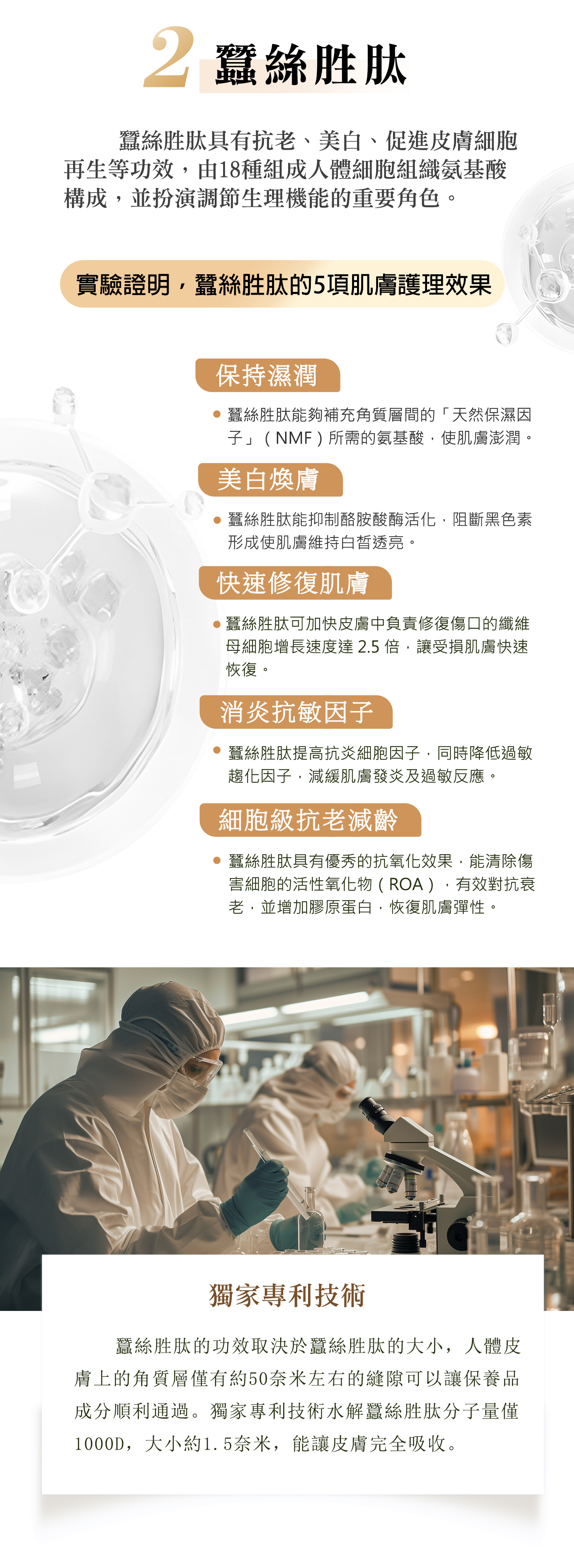 蠶絲胜肽的功效取決於蠶絲胜肽的大小,人體皮膚上的角質層僅有約50奈米左右的縫隙可以讓保養品成分順利通過。,獨家專利技術水解蠶絲胜肽分子量僅1000D,大小約1.5奈米,能讓皮膚完全吸收。